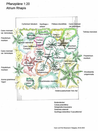 Für das spezielle Mikroklima der verglasten, aber halboffenen Atrien angepasste Pflanzenauswahl. Mit ganzjährig interessanten Blattstrukturen und Grüntönen, z.T. mit Raritäten.